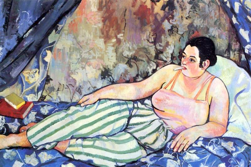 وتذكرنا لوحة “الغرفة الزرقاء” بلوحة ماتيس الصحراء الحمراء مع اختلاف الألوان والموضوع واللوحة عبارة عن امرأة بدينة ممدة على سرير أغطيته باللون الأزرق مرسوم عليها ورود بيضاء وستائر مفتوحة من نفس القماش بينما المرأة ترتدي بنطالا أبيض مخططا بالأخضر وتدخن سيجارة وبجانب قدميها كتاب أحمر، وكانت هذه اللوحة هي التي أطلقت شهرة فالادون التي كرست حياتها لرسم النساء بمواضيع مختلفة.
