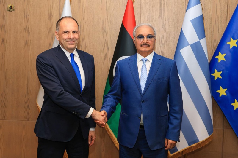 ودعا حفتر، الأحد، الشركات اليونانية المتخصصة في البنية التحتية وإعادة الإعمار، للمساهمة في المشاريع التنموية في ليبيا، وتعزيز المصالح المشتركة بين البلدين، في خضم استقباله وزير الخارجية اليوناني جورج جيرابيتريتيس والوفد المرافق له في بنغازي، والتباحث حول سبل دعم التعاون في المجالات الاقتصادية والتجارية.