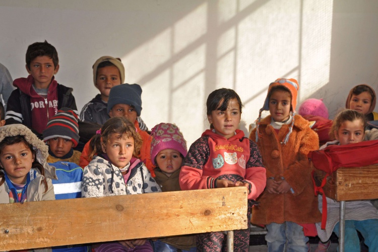 داخل غرفة الصفّ ذات الجدران الصفراء، يجلس ثلاثة أطفال على مقعد يتسع أساساً لطفلين فقط. يتصفح أحدهم كتاباً، وتكتب طفلة أخرى الأرقام على دفترها الصغير.
