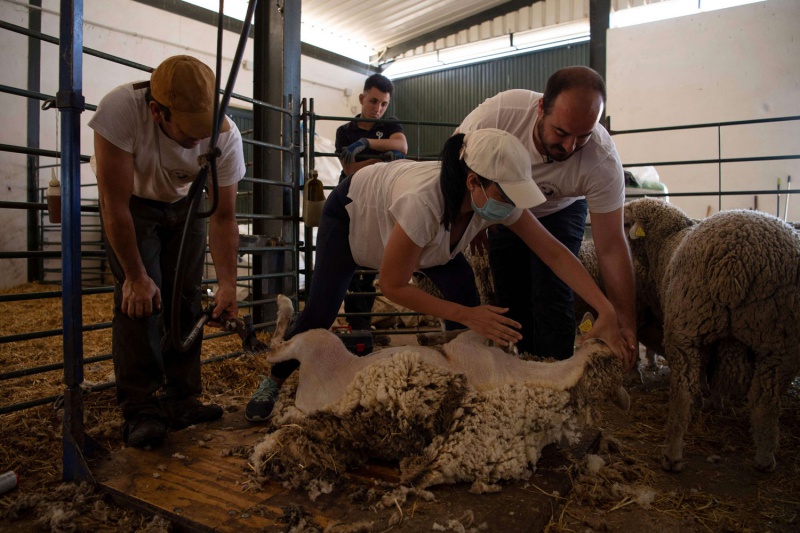 كاسار دي كاثري (إسبانيا) - تثبّت فانيسا كاستيو خروفًا بين ساقيها وتقرّب آلة الجزّ من صوفه السميك ممسكةً رأسه بيدها الأخرى، إذ أن الشابة العشرينية الخائفة من تأدية هذه المهمة هي من طلاب مدرسة للرعاة تقع غرب إسبانيا.