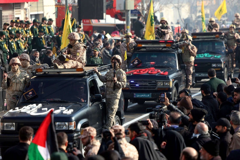 وسار رجال يرتدون الزي العسكري فيما استقل آخرون دراجات نارية ومركبات، وحمل بعضهم قاذفات صواريخ أمام حشود رفعت أعلام إيران وفلسطين وحزب الله اللبناني المدعوم من طهران.