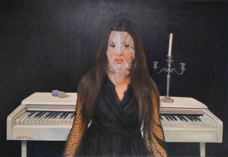أما لوحة “احتراس” فإنها تشير إلى التوازن بين الإبداع والاحتراس ومحاولة للحفاظ على مسافة بين الذات والعالم، وتشير إلى حالة من الوعي التي تعبر من خلال الموسيقى عن ذاتها ولكن بنفس الوقت تحجب الجزء من ذاتها العميقة خلف قناعها الشفاف.