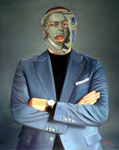 وتوحي لوحة “قناع المال” برمزية عميقة حيث تمثل الشخص بالقوة والجدية والسلطة والنفوذ، وتأثير المال بالوقت نفسه في تغيير القيم أو التحكم في الأشخاص ونقد المجتمع الذي تحكمه المادة.